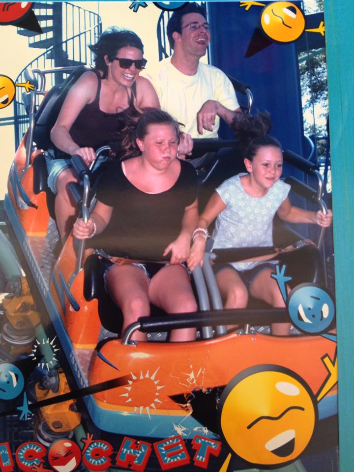 We selected a rollercoaster called “Ricochet” for our first ride, based on its bright colors and relatively tame appearance (no loops or big hills). We thought Richochet looked like a good ‘warm-up’. However, if we expected a stress-free, leisurely ride then we were sorely mistaken. The shenanigans started when my feet wouldn’t fit into the car. The seat was evidently not designed for someone who is 6’3’’ with a size 14 shoe. After struggling to wedge my feet in for a solid ten minutes and holding up a long line of eager kids, I finally got situated. So we sat back, ready to relax and enjoy the ride.