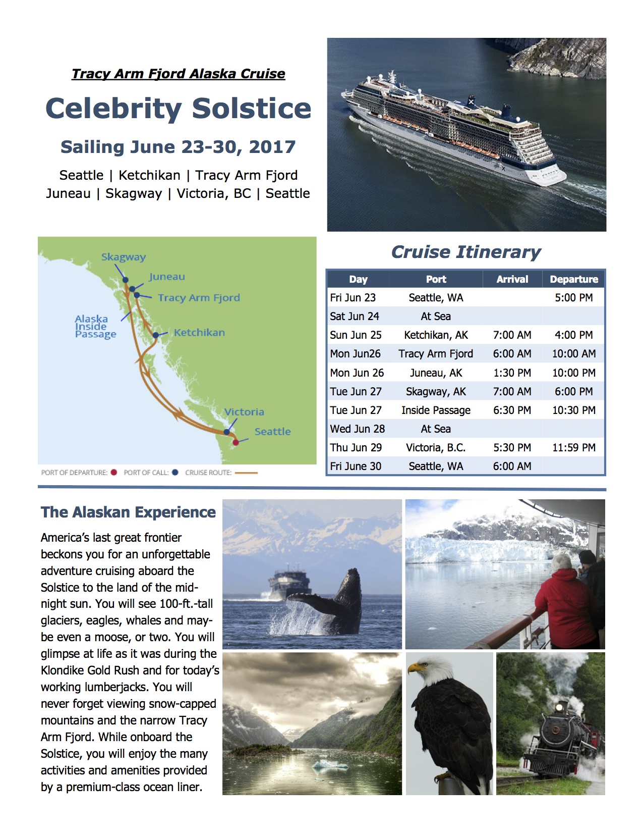I have received inquiries from several people regarding an Alaskan cruise for the summer of next year. I’ve done an Alaska cruise but since I was only 9 years old at the time this would be great to do again! I remember being amazed at the scenery. After doing some research I think the best option is going to be the sailing of the Celebrity Solstice out of Seattle from June 23 to June 30 next year. I was on board this ship for my cruise in Australia in 2013 and it was great. I’ve reserved rooms at the current pricing, which will likely only go up seeing as that is peak season and the itinerary, I believe, is a desirable one. This would be a great option for anyone who is a little nervous to travel because of limitations. Most of what you want to see is the natural scenery which can be viewed just as well from on board as off. Depending on who goes with us and their preferences I will arrange for private tours and excursions as needed which will allow you a great on shore experience no matter your limitations or your sense of adventure. We’ll probably fly out to Seattle a couple days early to familiarize ourselves with the city. I’ve never been to Seattle myself, but have heard nothing but good things. Please contact me at dbox@cruiseandtravelexperts.com or call 7043653564 if you’re interested. Remember you can reserve now with a deposit and keep the current room rate. The deposit is refundable up until Feb. 23, 2017 but I’m sure this is one you don’t want to miss.